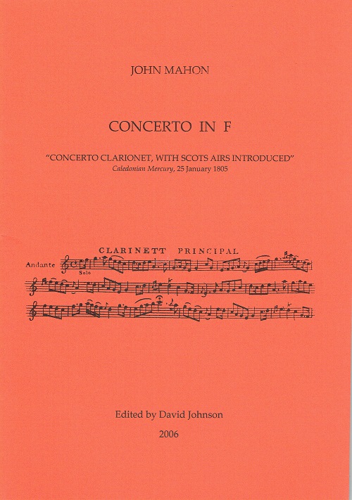 First publication since the 18th century. This, the 2nd (and the only one known to survive) of at least 8 concertos for clarinet by Mahon was composed c.1774. The 1st movement (Allegro) is influenced by Mannheim orchestral style; the 2nd movement (Andante) - the work’s crowning glory - introduces two Scots airs, ‘The Birks of Endermay’ and ‘Roslin Castle’. The 3rd movement (Rondo) is based on a theme from Thomas Arne’s ‘Comus’. John Mahon was born in Oxford, and developed into Britain’s finest clarinettist at a time when virtuosi of the instrument were almost unknown. He first appeared in Edinburgh in 1786 and from 1804-1808 had a permanent address in the city. He eventually retired to Dublin in 1825.