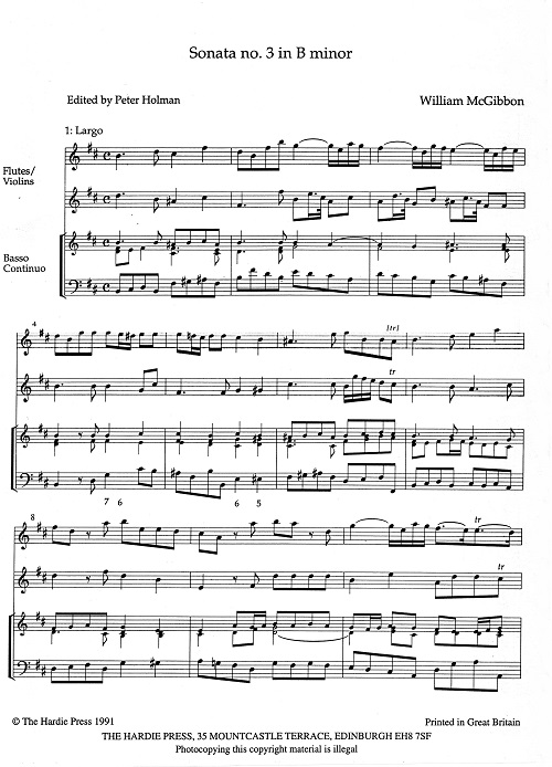 3 sonatas (B minor, G minor, G major) for two violins or flutes and continuo from the 1734 set. Full score with separate instrumental parts.