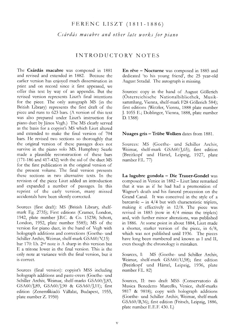 The volume was first published in 1952 under the title Late Piano Works, but now is newly engraved and expanded with several additions from original Liszt manuscripts. ‘Sospiri!’, the 5th piece in Fünf Klavierstücke für Olga Meyendorff, was not included in the 1952 edition, having only first appeared in 1963.