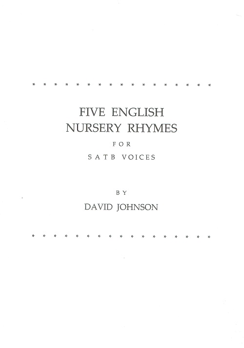 This set of songs on traditional English texts was composed in 1975 and first performed by the ensemble London Voices at the Purcell Room, London, that year. The texts date from c.1680-1840. 1. “Trip upon trenchers”, 2. “A was an Apple pie”, 3. “My mother said, I never should”, 4. “Puss came a-dancing”, 5. “Good night, sweet repose”. Suitable for choir or solo vocal quartet.