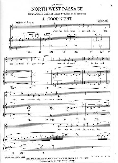 A song-cycle of 3 songs for soprano or treble and piano - settings from A Child's Garden of Verse by Robert Louis Stevenson - was published to mark the 100th anniversary of Stevenson's death.