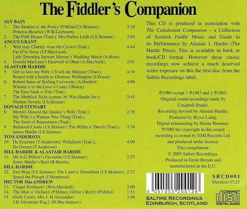 An associated album to The Caledonian Companion by Alastair Hardie, illustrating tunes from this book. Featuring Tom Anderson, Aly Bain, Angus Grant, Alastair Hardie, Bill Hardie, Hector MacAndrew, Donald Stewart, playing the repertoire with which they are particularly associated: Aly Bain – brilliant hornpipes and reels; Angus Grant – West Highland pipe-derived style; Tom Anderson – tunes of his native Shetland; Bill Hardie and Hector MacAndrew - some of their own compositions. Digitally re-mastered. 15 tracks. Running time 47:25 mins.