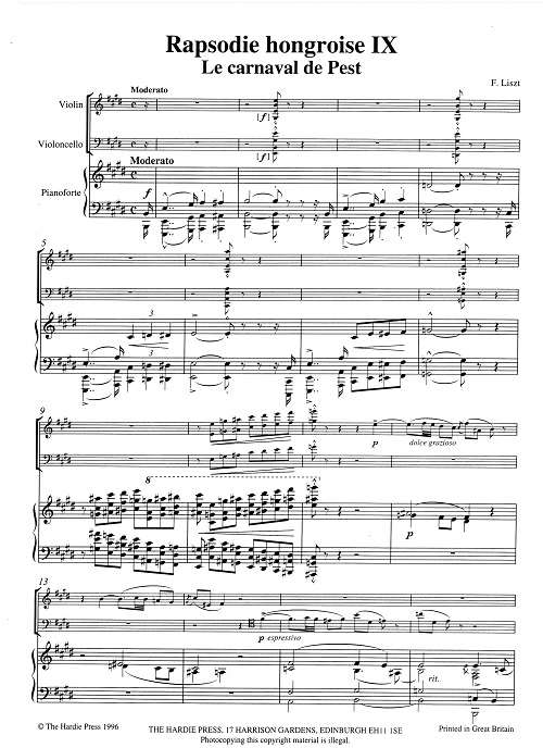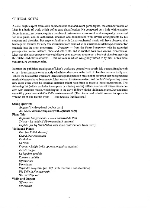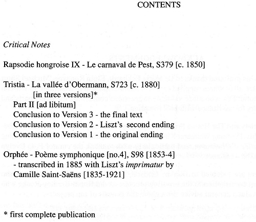 This edition, the first to include all of Liszt’s works for piano trio in one volume, comprises: Rapsodie hongroise IX – Le carnaval de Pest, S379 (c. 1850); Tristia – La vallée d’ Obermann, S723 (c. 1880) in three versions (first complete publication); Orphée – Poème symphonique (no. 4), S98 (1853-4) – transcribed in 1885 with Liszt's imprimatur by Camille Saint-Saëns.