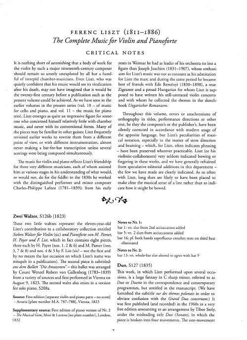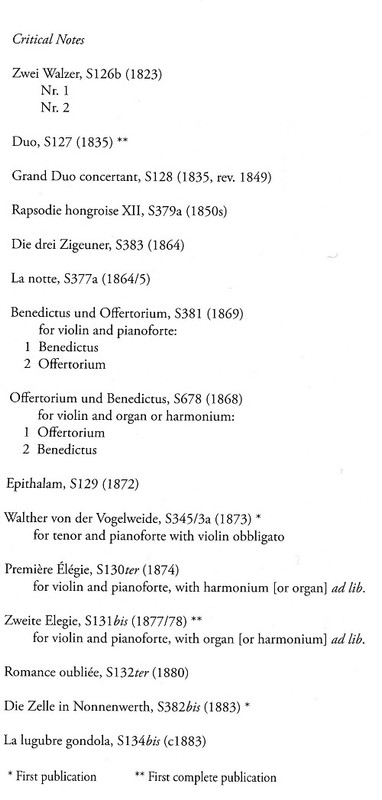 Critical Notes (10pp); Zwei Walzer, Nrs 1 & 2; *Duo (sur des thèmes polonais); Grand Duo concertant; Rapsodie hongroise XII; Die drei Zigeuner; La notte; Benedictus und Offertorium for violin and pianoforte; Offertorium und Benedictus for violin and organ or harmonium; Epithalam; *Walther von der Vogelweide for tenor and pianoforte with violin obbligato; Première Elégie for violin and pianoforte, with harmonium [or organ] ad lib., *Zweite Elegie for violin and pianoforte, with organ [or harmonium] ad lib.; Romance oubliée; *Die Zelle in Nonnenwerth; La lugubre gondola