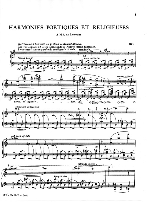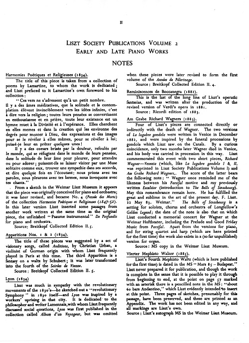 Contents: Harmonies Poétiques et Religieuses; Apparitions Nos. 1 and 2; Lyon; Réminiscences de Boccanegra; Am Grabe Richard Wagners for (1) string quartet and harp (ad lib.) (2) piano solo (first publications); Vierter Mephisto Waltz (first publication).