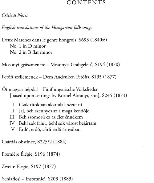 CONTENTS: Deux Marches dans le genre hongrois, No. 1 in D minor, No.2 in B flat minor, S693; Mosonyi gyászmenete - Mosonyis Grabgeleit, S194; Petőfi szellémenek - Dem Andenken Petőfis, S195; Öt magyar népdal - Fünf ungarische Volkslieder [based upon settings by Kornél Ábrányi, snr.], S245; Csárdás obstinée, S225/2; Première Élégie, S196; Zweite Elegie, S197; Schlaflos! - Insomnie! S203